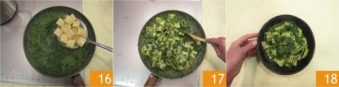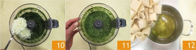 Ajoutez également un peu d'eau de cuisson, le Pecorino râpé 10 et mixez à nouveau pour obtenir une crème lisse 11. Mettez les pâtes 12 et cuisez-les al dente.
