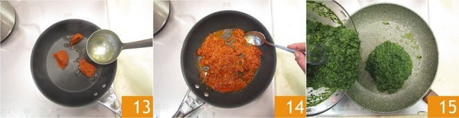 Entre-temps, dans une petite poêle, versez la 'nduja, ajoutez un peu d'eau de cuisson des pâtes 13 pour faciliter sa dissolution 14. Transférez la crème de chou noir dans une grande poêle 15.