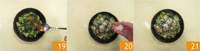 Ajoutez des petits tas de 'nduja dessus 19 et terminez avec un peu plus de Pecorino râpé 20. Les pâtes sont prêtes, il ne vous reste plus qu'à les servir 21.