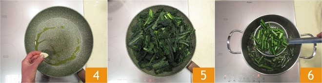 Entre-temps, faites revenir une gousse d'ail dans une poêle avec un filet d'huile 4 et ajoutez les feuilles de chou noir. Cuisez-les pendant environ 20 minutes 5, en ajoutant l'eau de cuisson des tiges si nécessaire et en couvrant avec un couvercle. Dès que les tiges sont tendres, égouttez-les à l'aide d'une écumoire 6, en gardant l'eau chaude.