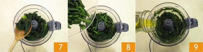 Transférez les feuilles de chou dans un mixeur 7, ajoutez les tiges 8 et mixez jusqu'à obtenir une crème. Versez un généreux filet d'huile d'olive 9.