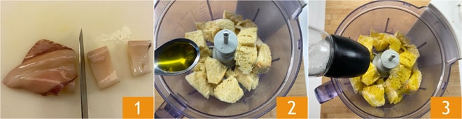 Pour préparer les calmars gratinés au four, commencez par vous occuper de la Comment nettoyer les calamars, puis coupez-les en anneaux de 2,5 cm d'épaisseur 1. Retirez la mie du pain et coupez-la grossièrement. Mettez-la dans un mixeur et ajoutez de l'huile 2, du sel 3 et du poivre.