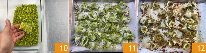 Passez les anneaux dans la panure 10 et déposez-les sur une plaque recouverte de papier sulfurisé 11. Faites cuire dans un four statique à 180°C pendant 20 minutes, puis passez à la fonction ventilée et continuez la cuisson pendant encore 5 minutes. Vos calmars gratinés au four sont prêts à être dégustés 12.