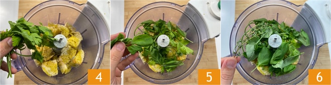 Ajoutez le persil 4, le basilic 5 et le thym 6.