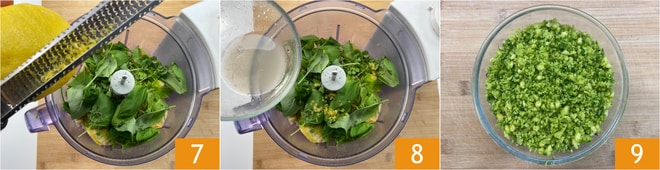 Continuez avec le zeste 7 et le jus de citron 8. Mixez jusqu'à obtenir une panure homogène 9.