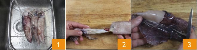 Pour réaliser les calamars aux olives, commencez par nettoyer les calamars en suivant notre école de cuisine : Comment nettoyer les calamars. Rincez les calamars sous l'eau courante 1, puis avec les mains détachez délicatement la tête du manteau et mettez-la de côté 2. Retirez également la plume de cartilage transparent qui se trouve dans le manteau. Passez à nouveau le calamar sous l'eau courante et extrayez les entrailles. Enfin, enlevez la peau externe 3.