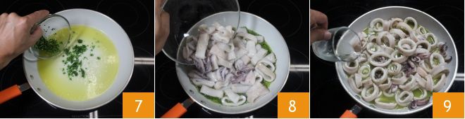 ajoutez le hachis d'échalote, de persil et d'ail 7, faites revenir quelques secondes puis ajoutez les calamars 8 et faites-les dorer pendant cinq minutes à feu moyen. Après cinq minutes, déglacez avec le vin blanc 9, laissez évaporer,