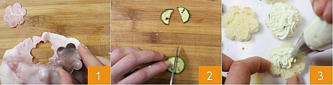 CANAPÉS AU JAMBON CUIT : Pour préparer les canapés au jambon cuit, utilisez le moule en forme de fleur pour découper 5 tranches de pain de mie 1 et 5 tranches de jambon cuit. Prenez 3 rondelles de courgettes grillées précédemment et coupez-les en deux 2. Composez maintenant les tartines en mettant une rosette de crème aux herbes sur chaque tartine 3 (si vous préférez, vous pouvez aussi utiliser la crème de crevettes),