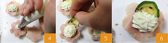 puis une tranche de jambon, une autre rosette de crème 4 et enfin décorez avec une demi-tranche de courgette 5. Les canapés au jambon cuit sont prêts ! 6