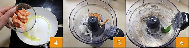Faites cuire les crevettes dans la poêle, pendant quelques minutes à feu vif 4. Une fois la cuisson terminée, mixez les crevettes avec un mixeur avec 50 g de Philadelphia 5, quelques feuilles de basilic, du sel et du poivre à votre convenance, jusqu'à obtenir une crème épaisse 6.