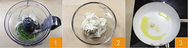 Pour préparer la crème aux herbes, mettez dans un mixeur 60 g de Philadelphia avec la ciboulette 1 et mixez le tout jusqu'à obtenir une crème épaisse 2, puis rectifiez l'assaisonnement avec du sel et du poivre si nécessaire. Pour préparer la crème de crevettes, lavez, nettoyez et décortiquez les crevettes et faites blondir une gousse d'ail avec un peu d'huile dans une poêle antiadhésive 3.