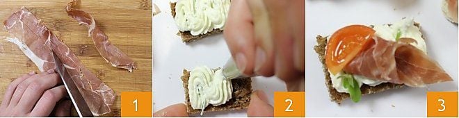 CANAPÉS AU JAMBON CRU : Pour préparer les canapés au jambon cru, coupez le jambon cru en lanières et enroulez-les sur elles-mêmes pour former des petites fleurs 1, puis coupez en quartiers deux tomates cerises. Prenez le pain de seigle, retirez-en la croûte avec un couteau et découpez 5 petits rectangles d'environ 5 cm de longueur (pour obtenir les petits rectangles, vous pouvez aussi utiliser les chutes de pain des préparations précédentes). Composez les canapés en déposant une rosette de crème aux herbes sur chaque tranche de pain 2. Complétez en mettant une petite fleur de jambon, un quartier de tomate et une feuille de basilic 3.