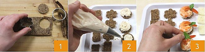 CANAPÉS AUX CREVETTES : Pour réaliser les canapés aux crevettes, commencez par préparer la base de pain de seigle : retirez la croûte avec un couteau, et avec un emporte-pièce de 5 cm, découpez 5 formes 1 (nous avons utilisé un moule en forme de fleur, comme celui des canestrelli, et le cercle, mais vous pouvez choisir la forme qui vous plaît le plus). Prenez 2 tomates cerises et coupez-les en quartiers, puis mettez la crème de crevettes dans une poche à douille et décorez les tranches de pain 2. Disposez une crevette avec la queue, que vous aurez préalablement cuite dans la poêle pendant quelques minutes avec un peu d'huile d'olive extra vierge et une gousse d'ail, sur chaque tartine et complétez la garniture avec un quartier de tomate cerise et une feuille de basilic 3. Vos canapés aux crevettes sont prêts !