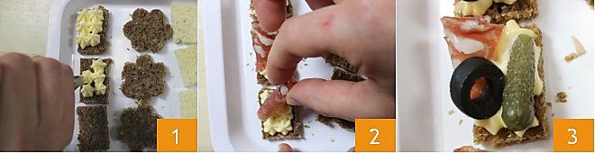 CANAPÉS AU SALAMI : Pour préparer les canapés au salami, coupez les tranches de salami en quartiers, découpez 5 petits rectangles de pain de seigle comme dans la préparation précédente, en utilisant également les restes des préparations précédentes, coupez une olive en fines rondelles, puis transférez la mayonnaise dans une poche à douille. Composez le canapé en déposant sur chaque tranche de pain de la mayonnaise 1 et un quartier de tranche de salami enroulé 2; décorez enfin avec un petit cornichon et une rondelle d'olive 3. Vos canapés au salami sont prêts !