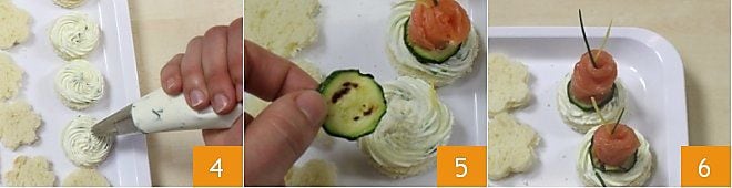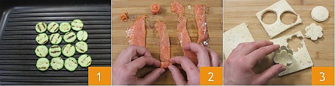 CANAPÉS AU SAUMON : Pour réaliser les canapés au saumon, coupez une courgette en fines rondelles et faites-les griller pendant quelques minutes (vous devriez obtenir 18 rondelles) 1. Prélevez le zeste d'un citron avec un épluche-légumes, puis coupez-le finement en julienne. Coupez des bandes de saumon de 1,5 cm de large et de 7-8 cm de long, puis roulez-les sur elles-mêmes pour obtenir la forme d'une rose 2. Prenez maintenant le pain de mie blanc, enlevez la croûte et, avec un emporte-pièce de 5 cm, découpez 5 formes (nous avons utilisé un moule en forme de fleur, comme celui des canestrelli, et un cercle, mais vous pouvez choisir la forme qui vous plaît le plus) 3.
