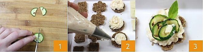 CANAPÉS COURGETTES ET CRÈME DE CREVETTES : Pour préparer les canapés aux courgettes et crème de crevettes, coupez en deux les 10 rondelles de courgettes grillées qui restent 1, garnissez les disques de pain de seigle avec la crème de crevettes 2 et décorez-les avec les courgettes pour former une fleur et une feuille de basilic 3. Vos canapés courgettes et crème de crevettes sont prêts.