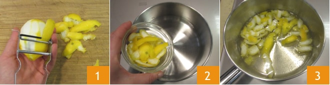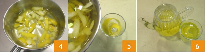 Pour préparer le canari, commencez par bien laver le citron et prélevez l'écorce avec un épluche-légumes, en veillant à éviter la partie blanche, sinon la boisson sera amère 1. Versez l'eau dans une casserole, ajoutez l'écorce de citron 2 et portez à ébullition, puis laissez mijoter environ 10 minutes 3.