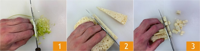 Pour préparer les canederli au fromage, commencez par émincer finement le poireau 1 et mettez de côté. Coupez le Puzzone di Moena, d'abord en tranches 2 puis en dés d'environ 1 cm 3. Coupez également le pain rassis en dés de la même taille que le fromage.
