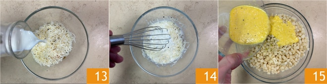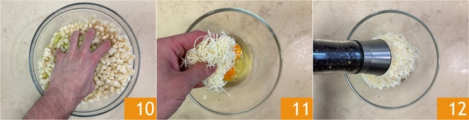 Remélangez le tout 10. Dans un autre bol, cassez les œufs, ajoutez le Trentingrana 11, salez et poivrez 12.