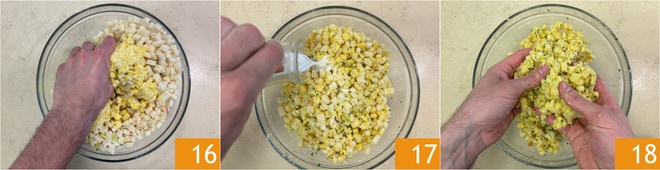 Mélangez bien à la main 16. Si nécessaire, vous pouvez ajouter le reste du lait 17; vous devez obtenir une pâte assez humide mais qui conserve sa forme 18.