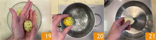 Avec les mains humides, façonnez les canederli, qui doivent avoir un diamètre d'environ 5 cm 19; avec ces quantités, vous en obtiendrez environ 12. Faites-les cuire dans de l'eau bouillante salée pendant environ 10 minutes 20. Il est important que l'eau ne bouille pas trop fort car cela pourrait casser les canederli. Pendant ce temps, faites fondre le beurre dans une poêle 21.