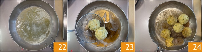 Chauffez à feu doux jusqu'à ce qu'il prenne une couleur noisette 22. Éteignez le feu et égouttez les canederli dans la poêle 23, puis arrosez-les de beurre noisette 24.