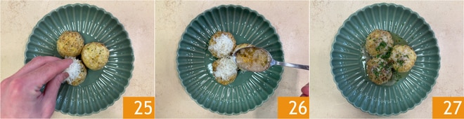 Servez-les et saupoudrez-les de Trentingrana 25, puis arrosez les canederli de beurre noisette 26 et complétez avec de la ciboulette. Vos canederli au fromage sont prêts à être dégustés 27 !