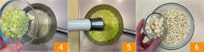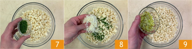 Ajoutez la ciboulette finement hachée 7, le Trentingrana râpé 8 et mélangez à la main, puis ajoutez le poireau 9.
