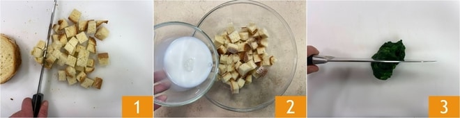 Pour préparer les canederli aux épinards, commencez par faire cuire les épinards, puis égouttez-les et pressez-les bien. Laissez-les refroidir et en attendant préparez aussi le bouillon de légumes. À ce stade, coupez le pain rassis en cubes 1 et transférez-le dans un bol. Ajoutez le lait 2 et laissez tremper. Entre-temps, transférez les épinards sur une planche à découper 3.