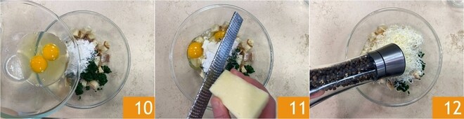 Ajoutez les œufs 10, l'Asiago râpé 11, le sel, le poivre 12 et une pincée de muscade râpée.