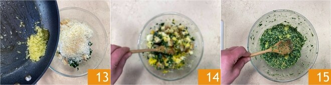 Ajoutez ensuite les oignons tièdes 13 et pétrissez avec une cuillère en bois 14, ou avec les mains. Vous devez obtenir un mélange homogène 15.
