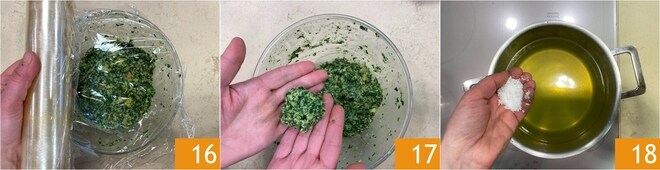 Couvrez avec un film plastique 16 et laissez reposer pendant 30 minutes. Après ce temps, vous pourrez former les canederli en leur donnant une forme ronde, similaire à des boulettes 17 ; avec ces quantités, vous en obtiendrez environ 12. Faites chauffer le bouillon de légumes et salez-le si nécessaire 18, puis portez-le à ébullition.