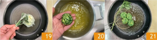 Entre-temps, dans une poêle, faites chauffer une noix de beurre, ajoutez des feuilles de sauge 19 et laissez infuser à feu doux. Faites cuire les canederli dans le bouillon désormais chaud pendant environ 10 minutes, ou jusqu'à ce qu'ils soient tendres 20. Ensuite, égouttez-les et faites-les sauter brièvement dans l'assaisonnement 21.