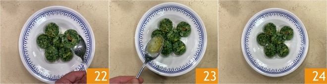 Dressez les canederli aux épinards 22, assaisonnez avec le fond de cuisson 23 et, si vous le souhaitez, saupoudrez de Parmigiano Reggiano DOP râpé 24 !