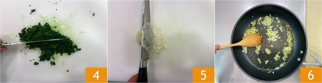 Émincez-les finement avec un couteau 4 et réservez. Épluchez l'oignon et émincez-le également finement 5. Faites chauffer un filet d'huile dans une poêle et ajoutez l'oignon 6.