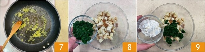Laissez l'oignon se faner pendant quelques minutes, puis éteignez le feu 7. Versez dans le bol avec le pain les épinards émincés 8 et la farine 9.