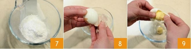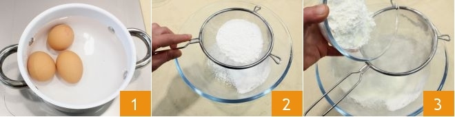 Pour préparer les canestrelli, commencez par cuire les œufs pour les rendre durs : il faudra 8 minutes dans de l'eau bouillante 1; les jaunes d'œufs seront ajoutés durs à la pâte pour garantir la bonne friabilité de la pâte. Dans le bol d'un robot, tamisez la farine, la fécule et le sucre glace (2-3).