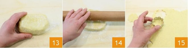 juste le temps de former un pâton à la consistance douce et lisse. Aplatissez-le légèrement et enveloppez-le dans du film transparent 13 (ou placez-le dans un récipient hermétique) et laissez au réfrigérateur environ 1 heure. Le temps nécessaire écoulé, étalez la pâte en un disque de 1 cm d'épaisseur 14 et avec un emporte-pièce en forme de fleur de 3 cm de diamètre, découpez les biscuits 15; vous pouvez réutiliser les chutes de pâte. Vous obtiendrez en tout 100 canestrelli.
