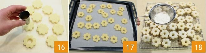 Réalisez ensuite le trou central typique avec un emporte-pièce de 1 cm de diamètre 16 (il existe dans le commerce des emporte-pièces spécialement pour les canestrelli qui permettent de faire directement le trou central). Faites cuire quelques canestrelli à la fois bien espacés entre eux, sur une plaque recouverte de papier sulfurisé 17, dans un four statique préchauffé à 170° pendant 18 minutes (vous pouvez aussi essayer avec le ventilé en cuisant une première fournée de quelques biscuits, à 150° pendant 8-10 minutes): ils ne doivent pas se colorer. Une fois cuits, sortez-les du four et laissez-les refroidir complètement sur une grille, puis saupoudrez-les de sucre glace 18 et servez les canestrelli comme petits gâteaux pour le thé ou conservez-les dans de petits sachets pour les offrir lors d'une occasion spéciale.