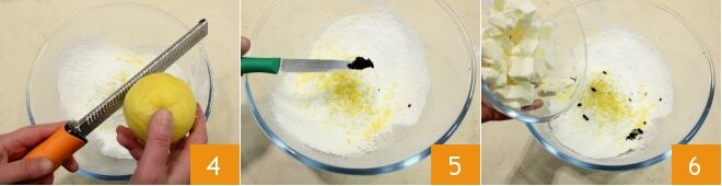 Ensuite, râpez le zeste de citron non traité 4 et ajoutez les graines d'une gousse de vanille 5; ajoutez également le beurre froid en morceaux 6