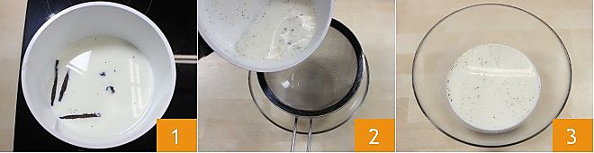 Pour préparer les cannelés, portez le lait à ébullition avec la gousse de vanille ouverte 1 ; dès que le lait frôle l'ébullition, retirez-le du feu, filtrez-le 2 et laissez-le tiédir 3.