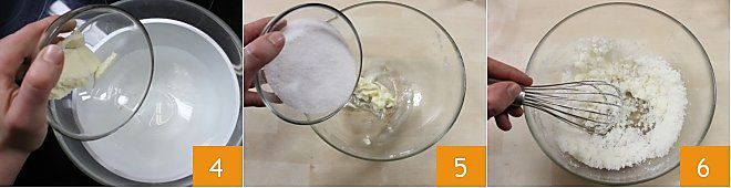 Faites ramollir le beurre au bain-marie 4, il doit avoir une consistance de pommade et, hors du feu, ajoutez le sucre en poudre (vous pouvez aussi utiliser du sucre de canne) et mélangez les deux ingrédients avec un fouet (5-6).