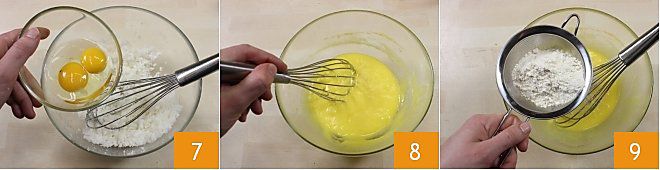 Ajoutez maintenant les œufs et incorporez-les bien au mélange (7-8) ; ajoutez la farine tamisée 9 et