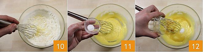 incorporez-la bien, en mélangeant continuellement avec le fouet 10. Enfin, ajoutez le sel et le rhum 12 et mélangez à nouveau pour éviter la formation de grumeaux.
