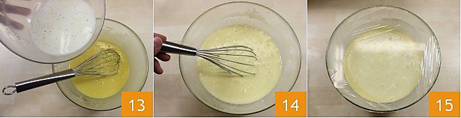 Lorsque le lait est froid, ajoutez-le au mélange 13 et mélangez bien 14 pour obtenir une pâte homogène. Couvrez le bol dans lequel vous avez travaillé avec un film plastique et laissez au réfrigérateur reposer au moins 24 heures 15. Pendant ce temps, l'alcool fermentera et permettra à la pâte de lever, de sorte qu'à la cuisson, vous obtiendrez la texture alvéolée typique des cannelés. Pour que cette étape se déroule correctement, la présence de l'alcool et le respect du temps de repos sont absolument nécessaires.