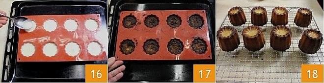 Après le temps nécessaire, prenez un moule à cannelés et badigeonnez-le généreusement de beurre ; placez ensuite le moule au réfrigérateur pendant une dizaine de minutes pour permettre au beurre de se solidifier. Versez la pâte à cannelés dans le moule, en laissant 2-3 millimètres d'espace par rapport au bord 16. Remettez le moule au réfrigérateur pendant environ 15 minutes puis passez-le directement au four statique déjà chaud à 200° pour 1 heure et 30 minutes (si four ventilé, 180° pour 1 heure et 20). Pendant la cuisson, vous verrez que les cannelés gonfleront beaucoup avant de revenir lentement dans le moule. Sortez les cannelés qui seront très bruns à l'extérieur : c'est leur caractéristique, due à la caramélisation du sucre pendant la cuisson 17. Laissez-les tiédir dans le moule et quand ils sont tièdes, démoulez-les 18 et servez-les immédiatement !