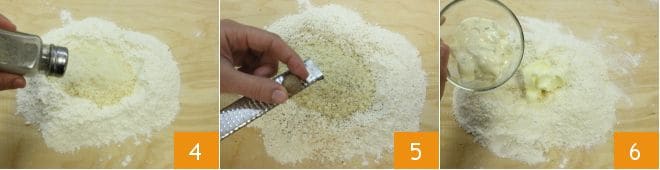 Pour réaliser les cantucci au gorgonzola, commencez par griller les pignons : mettez une poêle sur le feu et faites griller les pignons en remuant fréquemment pour éviter qu'ils ne brûlent 1. Laissez refroidir les pignons, puis mettez-les avec les noix dans un mixeur et hachez-les grossièrement pendant quelques instants, ils ne doivent pas être finement hachés 2. Ensuite, procédez à la préparation de la pâte pour les cantucci : sur un plan de travail, tamisez la farine, le bitartrate de potassium et le bicarbonate et formez la classique fontaine. Versez au centre le Parmigiano Reggiano râpé 3, salez,