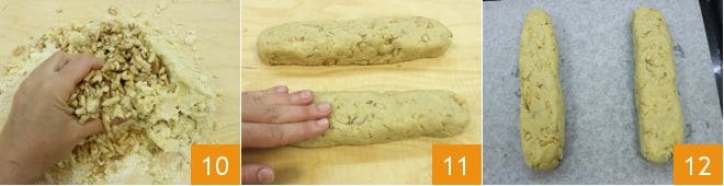 Enfin, ajoutez les noix et les pignons hachés 10. À ce stade, formez avec la pâte deux boudins d'environ 30 cm de long 11. Transférez les boudins sur une plaque de cuisson recouverte de papier sulfurisé 12 et faites cuire pendant 20 minutes dans un four statique préchauffé à 190° (ou dans un four à convection à 170° pendant environ 15 minutes).
