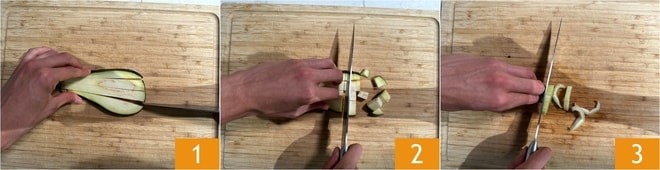 Pour préparer la caponata de poisson à l'espadon, équeutez les aubergines et coupez-les d'abord en tranches de 1 cm 1, puis en dés 2. Émincez aussi les côtes de céleri 3.