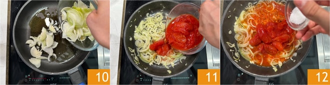 Ajoutez les oignons émincés 10 et faites-les revenir à feu doux pendant quelques minutes, puis ajoutez les tomates pelées 11 et salez 12.